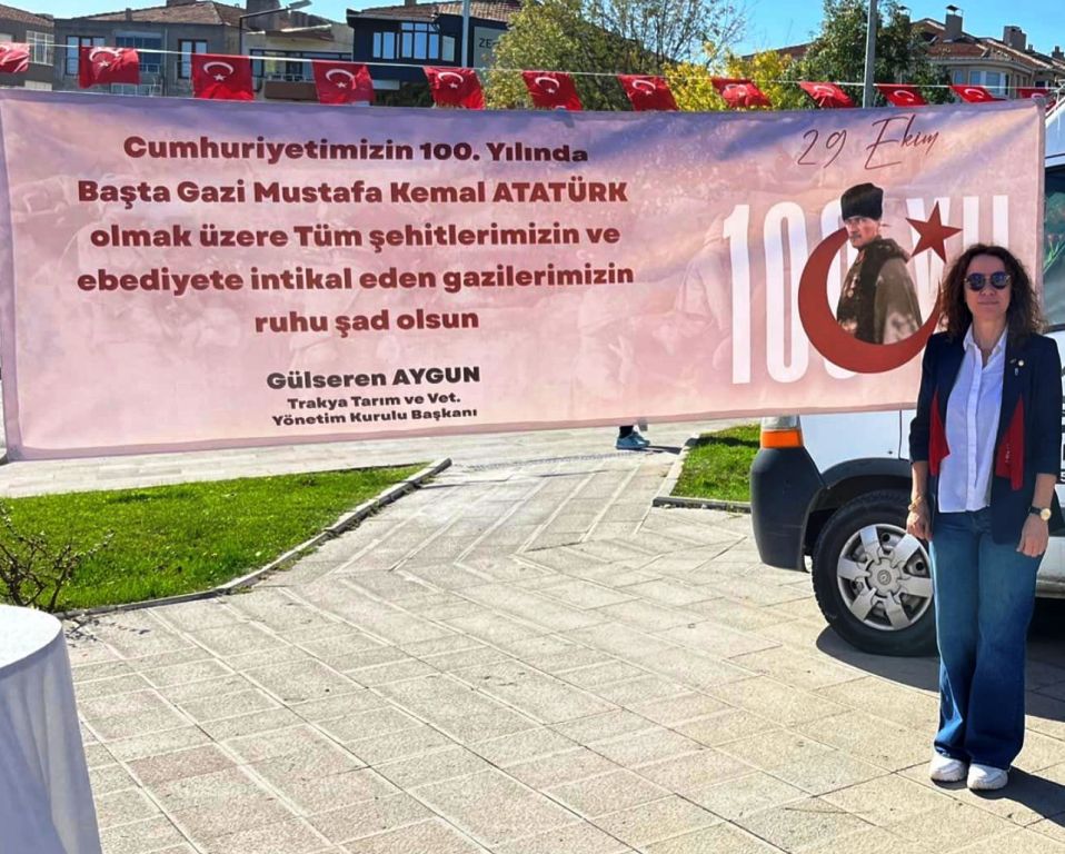 Gerçekleşen organizasyon ile ilgili kısa bir açıklama yapan Trakya Tarım Yönetim Kurulu Başkanı Gülseren Aygun, “Trakya Tarım Ailesi olarak Cumhuriyet’imizin 100. Yılında başta Ulu Önderimiz Gazi Mustafa Kemal Atatürk olmak üzere tüm şehitlerimizin ve ebediyete intikal eden gazilerimizin ruhuna lokma dağıtımında bulunduk. Çocuklarımıza balon ve bayrak armağan ettik. Cumhuriyetimizin 100. yılını kutlarken geçmişimizi unutmayıp gelecek nesillerimize hedef gösterdik. Mustafa Kemal Atatürk’ün ışığıyla sonsuza kadar sürecek Cumhuriyet yürüyüşümüzün 100. yılı kutlu olsun. Nice yüzyıllara Türkiyem!” ifadelerini kullandı.