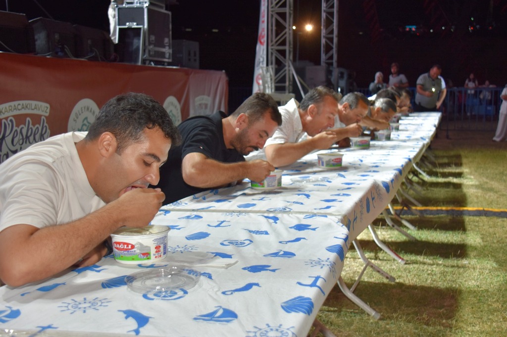 TBB Kent Orkestrası’nın konseri sona erdiğinde, Keşkek Şenliği’nin değişmez etkinliklerinden biri olan altın ödüllü Yoğurt Yeme Yarışması gerçekleştirildi. Seyirciler arasından gönüllü olan yarışmacılar, bir kilogramlık yoğurdu bitirmeye çalıştı. Kadınlar ve erkekler olarak iki kategoride yapılan yarışmada ilk ikiye giren katılımcılar çeyrek ve gram altın kazanırken, diğer yarışmacılara da yarım gramlık teselli ödülü takdim edildi. Yarışmacılara ödüllerini Süleymanpaşa Belediye Başkanvekili Emin Benan Utku ve protokol temsilcileri takdim ettiler.
