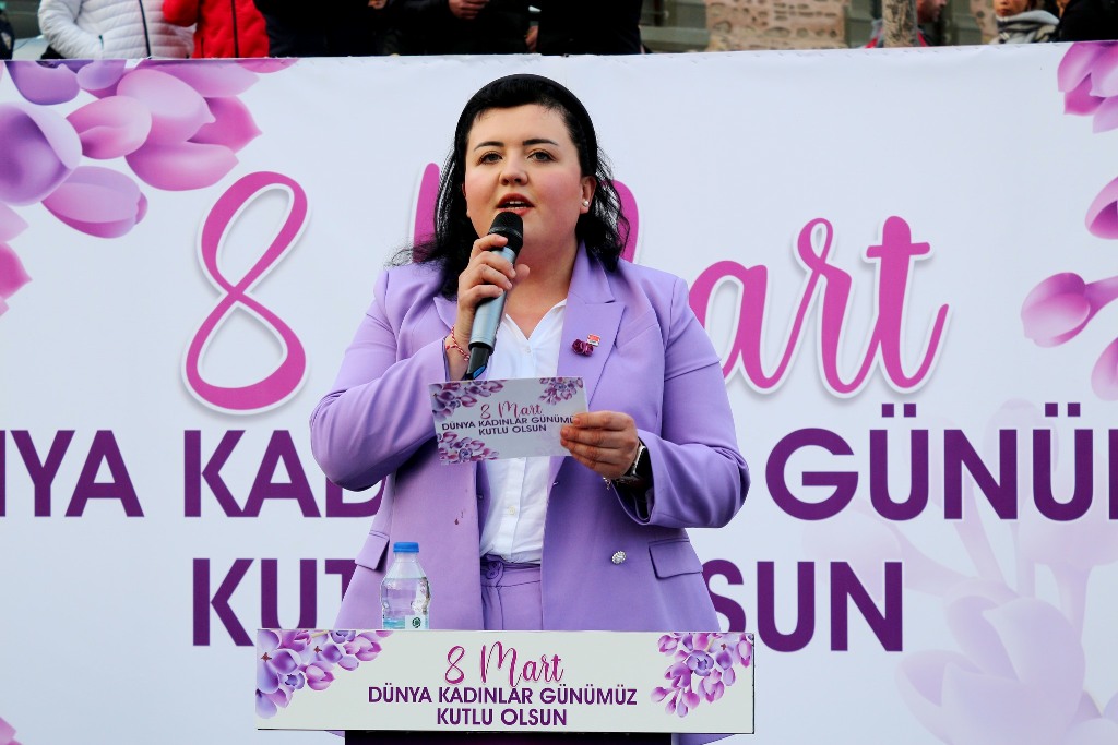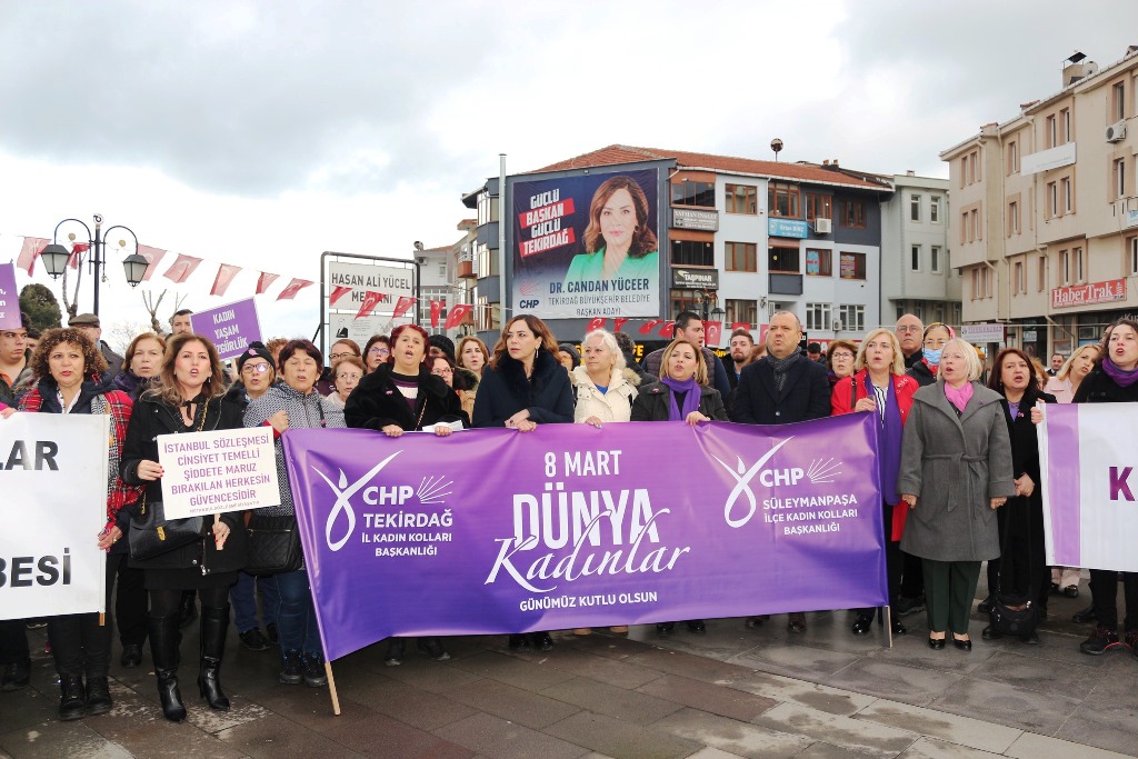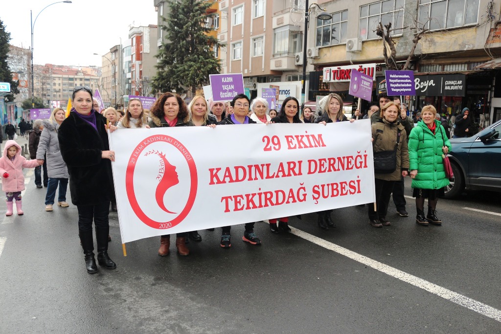 Pankartlar ve sloganlar eşliğinde gerçekleşen yürüyüşün ardından Hasan Ali Yücel Meydanında yürüyüş sona ererken saygı duruşu ve İstiklal Marşımızın okunmasının ardından 29 Ekim Kadınları Derneği Tekirdağ Şube Başkanı Seval Eşer, alanda toplanan kadınlara seslenerek; “Geçenlerde aile bakanı Mahinur Hanım şöyle dedi; ‘Kadınlar bu topraklarda özgürdür.’ Neler oluyor Mahinur Hanım? Nasıl özgürlük bu? Sizin özgürlük anlayışınız nedir? Eğer ki sizin özgürlük anlayışınız her gün 8’er 8’er kadın öldürülmesiyse buna özgürlük mü diyorsunuz? Bizler için özgürlük laik yaşamaktır. Bizler için özgürlük arkasına bakmadan sokaklarda korkusuzca, gülümseyerek, benim gibi kırmızı rujunu sürerek yürümektir. Bizim için özgürlük ölümü göze almadan, ölümle tehdit edilmeden boşanmaktır. Bu gün ne güzel ki Tekirdağ Büyükşehir Belediyesi için bir kadın adayımız var; kadınların haklarını koruyacak Candan Yüceer var. Teşekkür ediyoruz.” dedi.