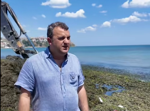 Sahilde biriken yosunların kötü koku oluşturması ve denize girişi engellemesi üzerine vatandaşların taleplerini yerine getirmek için harekete geçtiklerini belirten Başkan Volkan Nallar; “Değirmenaltı sahildeyiz. Alkaya Değirmenaltı yolunun birleştiği alandayız. Doğru bir yapılanma yapılamadığı için, bir mühendis ile birlikte çalışılmadığı için, mendireklerdeki hatalardan ve doğal dengenin de bozulmasından dolayı yosun ile birlikte burada pis bir koku oluyor. Kokunun yanı sıra çevre kirliliği görüntüsü oluşuyor.İnsanlar denize giremiyorlar. Bahçelerinde oturamıyorlar, çaylarını bile içemiyorlar.Vatandaşımız konu ile ilgili şikayetini iletti. Pazar günü olmasına rağmen Belediye Başkan Yardımcım, Fen İşleri Müdürüm, Park Bahçeler Müdürüm, herkes burada. Bende belediye başkanı olarak koştum geldim.” dedi.