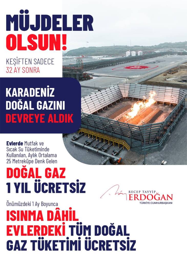Karadeniz’de keşfedilen doğal gazın gerçekleştirilen törenle devreye alınmasının ardından, Cumhurbaşkanı Recep Tayyip Erdoğan tarafından iki büyük müjde açıklandı. Buna göre evlerde 25 metreküpe kadar doğal gaz 1 yıl boyunca ücretsiz olacak. 1 ay boyunca ise ısınma dâhil tüm doğal gaz faturaları ücretsiz olacak.