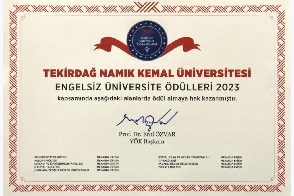 Engelsiz Üniversite Ödülleri 2023 kapsamında NKÜ Fen-Edebiyat Fakültesi, Hukuk Fakültesi, İktisadi ve İdari Bilimler Fakültesi, İlahiyat Fakültesi, Marmara Ereğlisi Meslek Yüksekokulu, Sosyal Bilimler Meslek Yüksekokulu, Tıp Fakültesi, Yabancı Diller Yüksekokulu ve Ziraat Fakültesi binaları ödül almaya hak kazandılar.