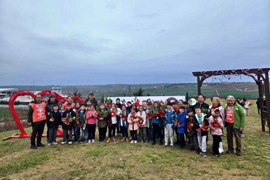 250 fidanı toprakla, 250 öğrenciyi fidanlarla buluşturdular. Her fidanın üzerine her çocuk kendi ismini ekleyerek bakımını üstlendi.