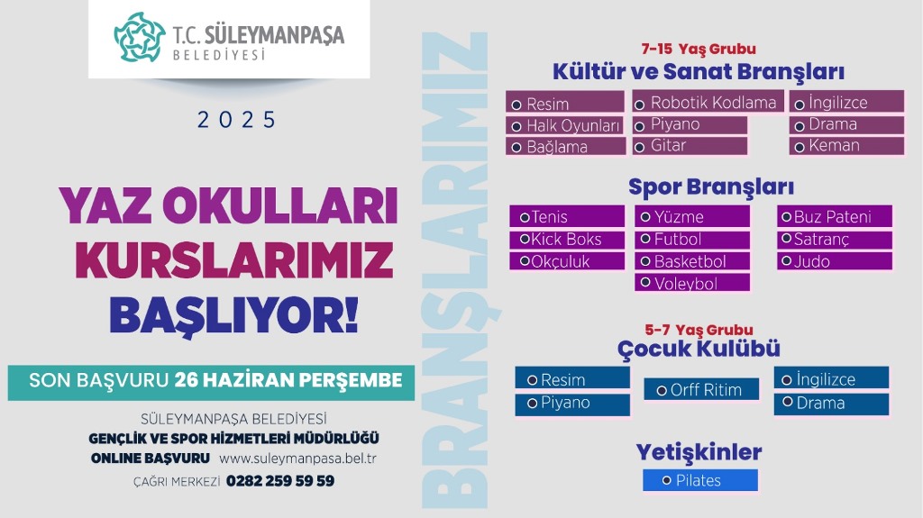 Kontenjanların sınırlı olduğu yaz okullarına başvurular, www.suleymanpasa.bel.tr adresi üzerinden çevrimiçi olarak yapılabilecek. Eğitimlerin gerçekleştirileceği kurs merkezleri ise başvuru sürecinin ardından duyurulacak.