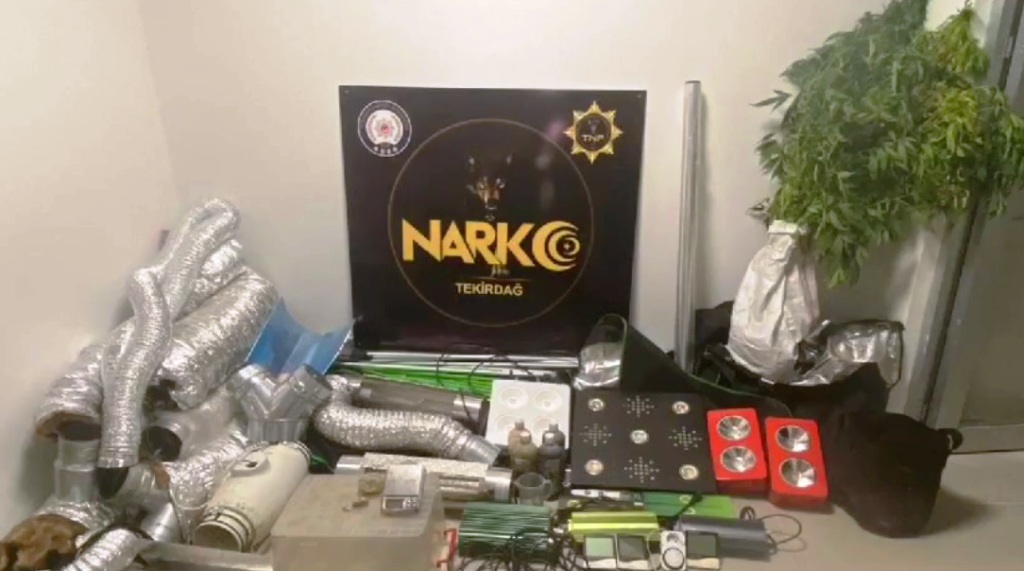 Ertuğrul Mahallesi’nde gerçekleşen olayda B.E.K isimli şahsın ikametinde yapılan aramalarda 6 kök Hint keneviri bitkisi, 30 Gr Hint keneviri tohumu, 1 adet kenevir öğütücü ve içerisinde 0,5 Gr Esrar maddesi, 1 adet çalışır vaziyette hassas terazi, 16 adet 1 lt lik kutu içerisinde sıvı kimyasal gübre, 9 adet şeffaf kilitli poşet, 18 adet ısıtıcı amacıyla kullanılan nitelikli ampül, 3 adet ısı ölçer termostat, 3 adet saat ayarlı priz,4 adet 600W güç adaptörü, 4 adet büyük boy havalandırma borusu, Yaklaşık 2 m uzunluğunda rulo Alüminyum folyo, 2 adet aydınlatma düzeneği, 2 adet içerisinde bitki yetiştirilen kapalı bez kabin, 4 adet bez saksı ele geçirildi.
