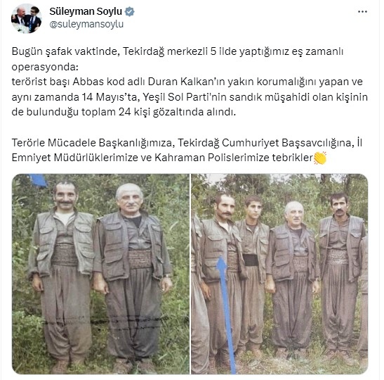 Öte yandan İçişleri Bakanı Süleyman Soylu da konuyla ilgili olarak kendi twitter hesabından paylaşımda bulunurken emniyet güçlerine teşekkür etti. Bakan Soylu; “Bugün şafak vaktinde, Tekirdağ merkezli 5 ilde yaptığımız eş zamanlı operasyonda terörist başı Abbas kod adlı Duran Kalkan’ın yakın korumalığını yapan ve aynı zamanda 14 Mayıs’ta Yeşil sol Parti’nin sandık müşahidi olan kişinin de bulunduğu 24 kişi gözaltına alındı. Terörle Mücadele Başkanlığımıza, Tekirdağ Cumhuriyet Başsavcılığımıza, İl Emniyet Müdürlüklerimize ve Kahraman Polislerimize tebrikler.” İfadelerini kullandı.