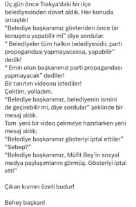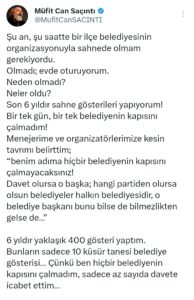 “BELEDİYE BAŞKANIMIZ, MÜFİT BEY’İN SOSYAL MEDYA PAYLAŞIMLARINI GÖRMÜŞ. GÖSTERİYİ İPTAL ETTİ”