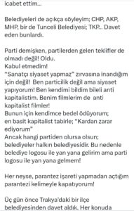 Öncelikle konuyla ilgili bir tweet atan Müfit Can Saçıntı; “Şu an, şu saatte bir ilçe belediyesinin organizasyonuyla sahnede olmam gerekiyordu. Olmadı; evde oturuyorum. Neden olmadı? Neler oldu? Son 6 yıldır sahne gösterileri yapıyorum! Bir tek gün, bir tek belediyenin kapısını çalmadım! Menejerime ve organizatörlerimize kesin tavrımı belirttim; “benim adıma hiçbir belediyenin kapısını çalmayacaksınız! Davet olursa o başka; hangi partiden olursa olsun belediyeler halkın belediyesidir, o belediye başkanı bunu bilse de bilmezlikten gelse de…” 6 yıldır yaklaşık 400 gösteri yaptım. Bunların sadece 10 küsür tanesi belediye gösterisi… Çünkü ben hiçbir belediyenin kapısını çalmadım, sadece az sayıda davete icabet ettim… Belediyeleri de açıkça söyleyim; CHP, AKP, MHP, bir de Tunceli Belediyesi; TKP… Davet eden bunlardı. Parti demişken, partilerden gelen teklifler de olmadı değil! Oldu. Kabul etmedim! “Sanatçı siyaset yapmaz” zırvasına inandığım için değil! Ben particilik değil ama siyaset yapıyorum! Ben kendimi bildim bileli anti kapitalistim. Benim filmlerim de anti kapitalist filmler! Bunun için kendimce bedel ödüyorum; en basit kapitalist tabirle; “Kardan zarar ediyorum” Ancak hangi partiden olursa olsun; belediyeler halkın belediyesidir. Bu nedenle belediye logosu ile yan yana gelirim ama parti logosu ile yan yana gelmem! Her neyse, parantez işareti yapmadan açtığım parantezi kelimeyle kapatıyorum!” dedi.