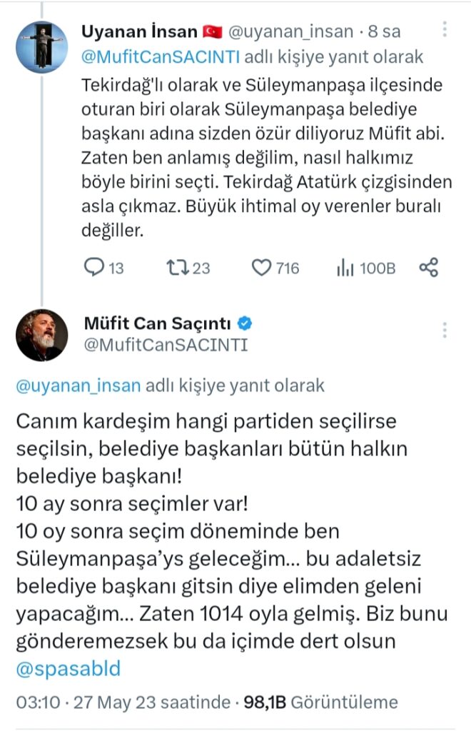 Müfit Can Saçıntı’nın paylaşımı sonrasında sosyal medyadan binlerce beğeni ve destek mesajı gelirken “Uyanan İnsan” adlı kullanıcının yaptığı; “Tekirdağ’lı olarak ve Süleymanpaşa ilçesinde oturan biri olarak Süleymanpaşa belediye başkanı adına sizden özür diliyoruz Müfit abi. Zaten ben anlamış değilim, nasıl halkımız böyle birini seçti. Tekirdağ Atatürk çizgisinden asla çıkmaz. Büyük ihtimal oy verenler buralı değiller.” Yorumuna cevap veren Müfit Can Saçıntı; “Canım kardeşim hangi partiden seçilirse seçilsin, belediye başkanları bütün halkın belediye başkanı! 10 ay sonra seçimler var! 10 oy sonra seçim döneminde ben Süleymanpaşa’ys geleceğim… bu adaletsiz belediye başkanı gitsin diye elimden geleni yapacağım… Zaten 1014 oyla gelmiş. Biz bunu gönderemezsek bu da içimde dert olsun @spasabld” ifadelerini kullandı.