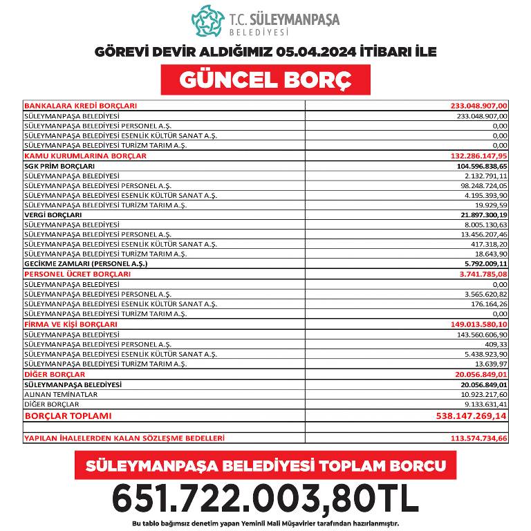 Süleymanpaşa Belediyesi Tarihi Belediye Binasına pankart asarak kalem kalem tüm borçları açıklayan Volkan Nallar; hazırlanan tablonun bağımsız denetim yapan yeminli mali müşavirler tarafından yapıldığının altını çizdi.